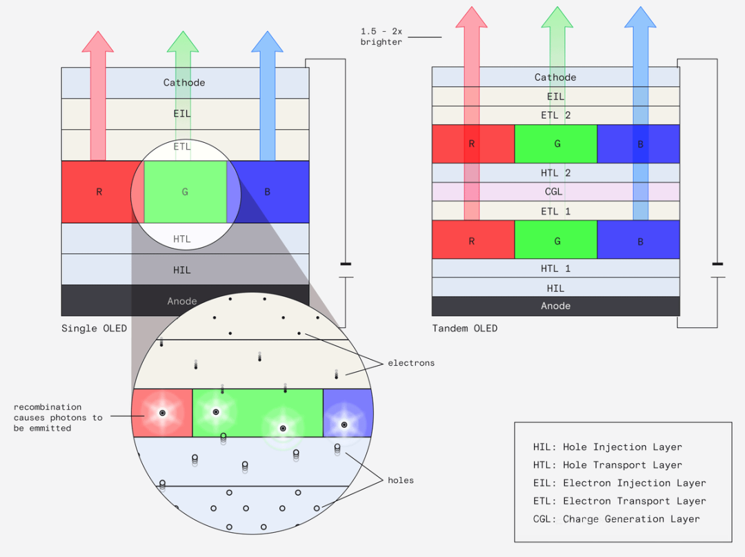 Дополнително, повеќеслојната тандем структура поставува повеќе единици што емитуваат светлина преку слојот за генерирање полнење (CGL), зголемувајќи ја осветленоста додека го продолжува животниот век на уредот. Овие технологии дополнително доведоа до мејнстрим решенија за масовно производство како што се WOLED и QD-OLED.