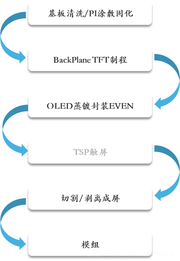 Основниот процес на производство на AMOLED вклучува неколку високотехнички процеси на единицата. Во процесот на Backplane TFT (BP), технологијата на поликристален силикон со ниска температура (LTPS) стана мејнстрим поради неговата висока мобилност на електрони. Нејзиниот процес на структура на горната порта вклучува чекори како што се таложење на тампон слој, имплантација на канал јони, кристализација со ласерско жарење (ELA), распрскување на метал на портата и имплантација на извор-одвод. Специјалните гасови играат клучна улога во таложење, модификација и офорт на тенок слој: на пример, процесите PECVD користат SiH4/N2O/NH3 за да таложат a-Si/SiNx/SiOx тенки филмови; Атомското таложење на слојот (ALD) користи TMA и H2O за да формира слоеви на капсулирање Al2O3; со суво офорт се постигнува високопрецизно обликување преку гасови како што се CF4/SF6/Cl2, каде што BCl3 се користи за намалување на слоевите на метални оксиди, а Cl2 генерира испарливи производи за офорт, обезбедувајќи чист и ефикасен процес.