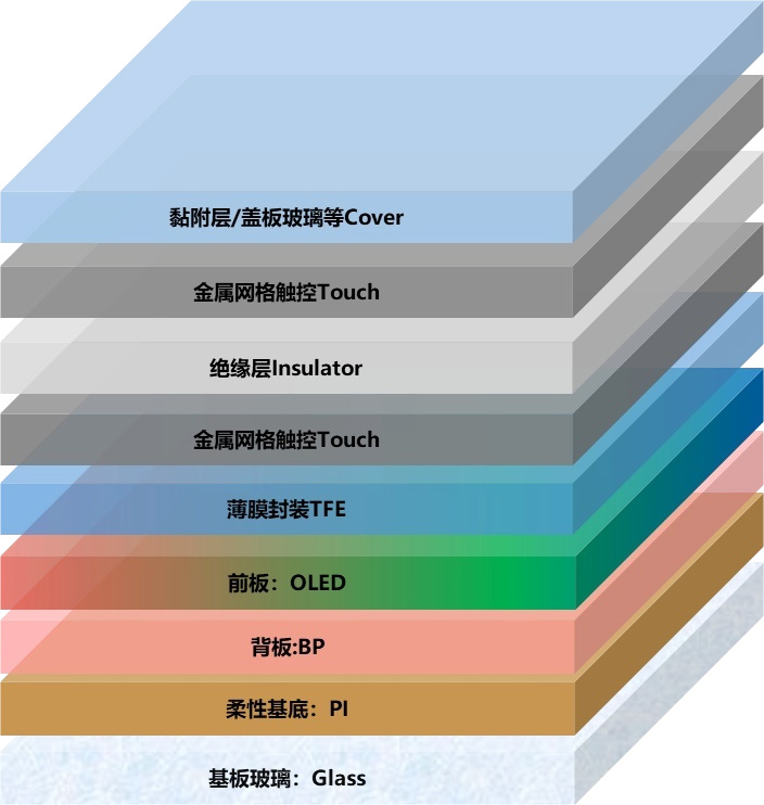 Нејзината основна структура вклучува OLED слој што емитува светлина, TFT задна рамнина, метални електроди, стакло на подлогата и обвивка.