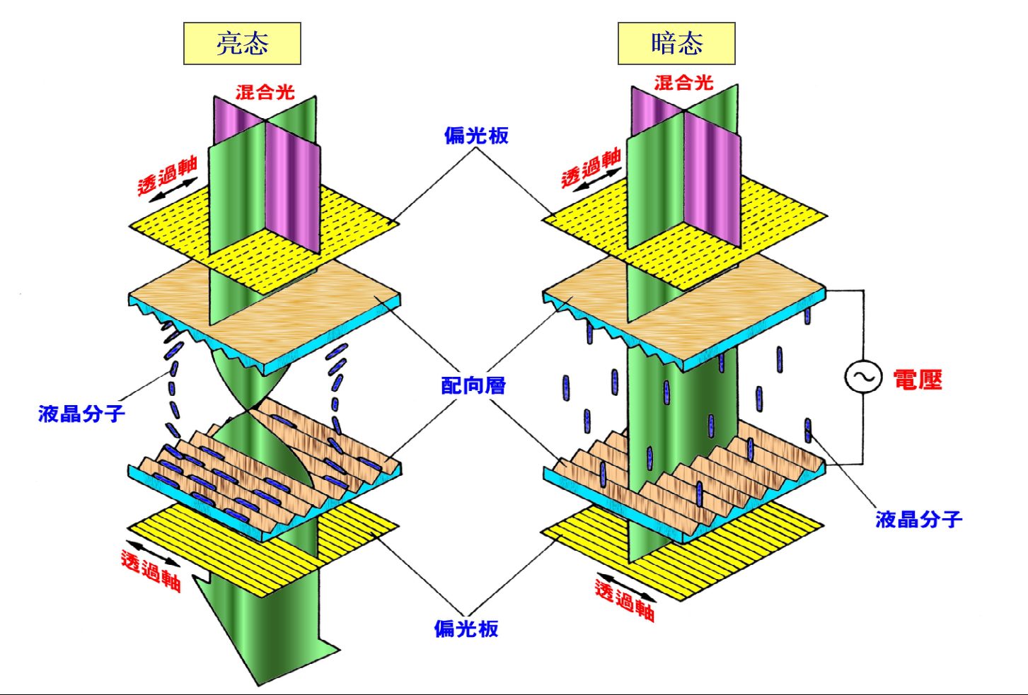 Во темна состојба (состојба на екранот), молекулите на течните кристали во областите каде што е применето електрично поле го менуваат нивното усогласување и ја губат способноста за ротирање на светлина. Поларизираната светлина што се емитува од предниот поларизатор не може да ја промени насоката и е блокирана бидејќи нејзината насока на поларизација е нормална на онаа на задниот поларизатор, предизвикувајќи овие области да изгледаат црни.