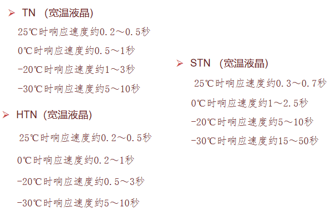Брзината на одговор, вклучувајќи го времето на пораст (Tr) и времето на паѓање (Tf), мери колку брзо LCD екранот реагира на сигналите. Реолошките својства на течните кристали ја одредуваат нивната силна температурна зависност: колку е помала температурата, толку е поголема вискозноста на течните кристали и толку е помала брзината на одговор.