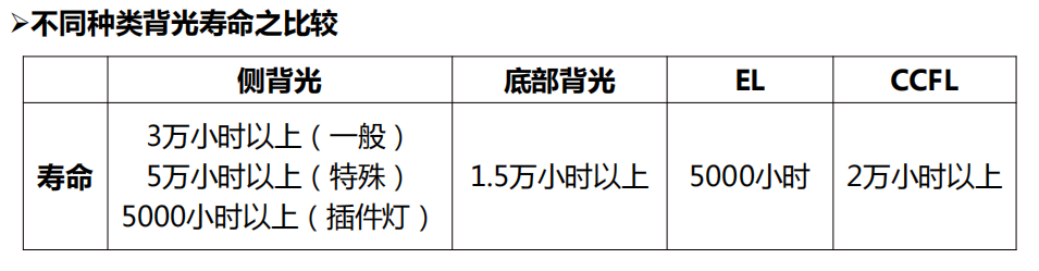Различните технологии на извори на светлина даваат различни карактеристики на позадинското осветлување, задоволувајќи ги различните барања на пазарот: